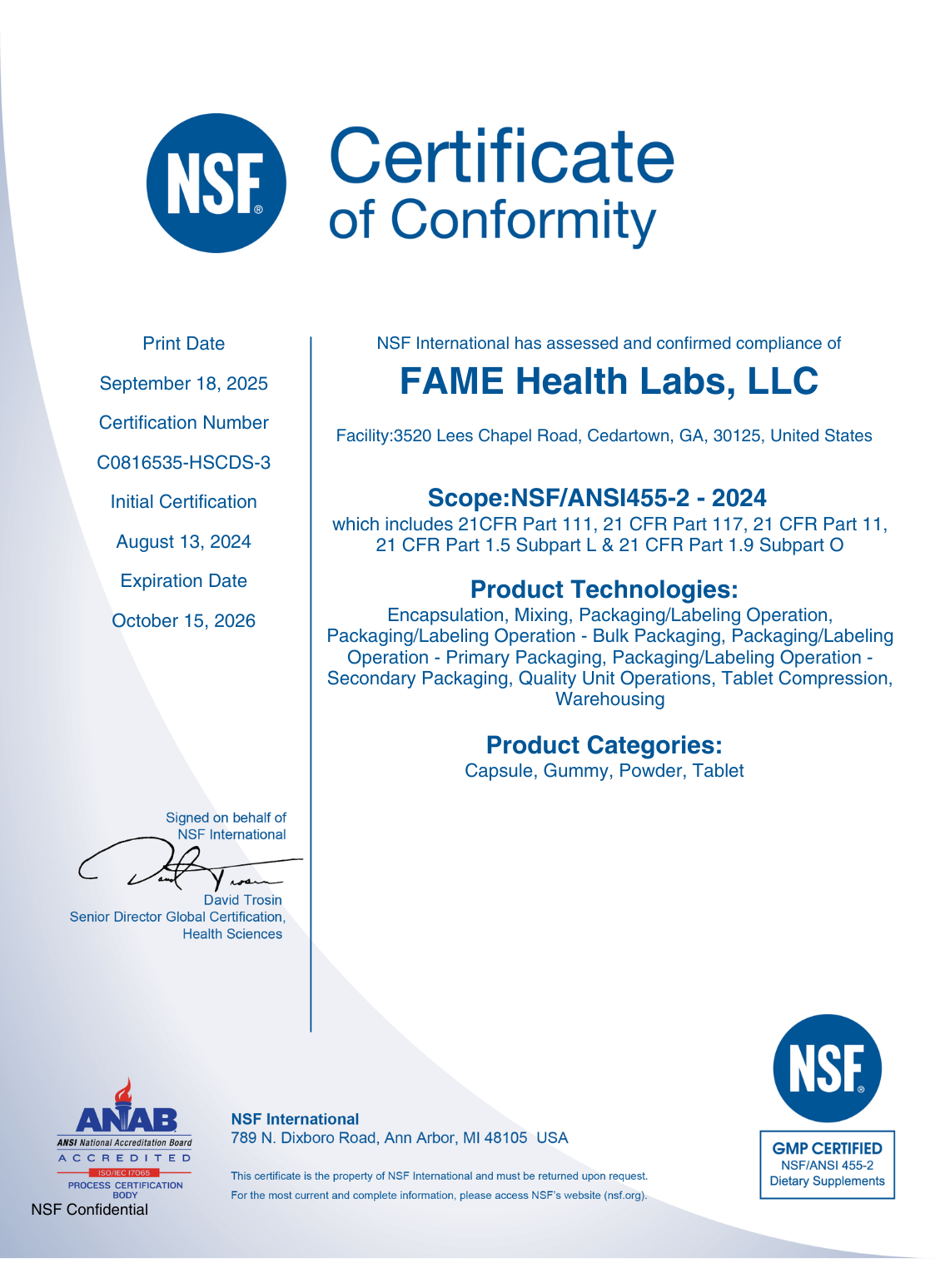 All our products are manufactured in certified facilities that comply with NSF/ANSI 455-2:2024 standards and U.S. federal regulations (21 CFR).